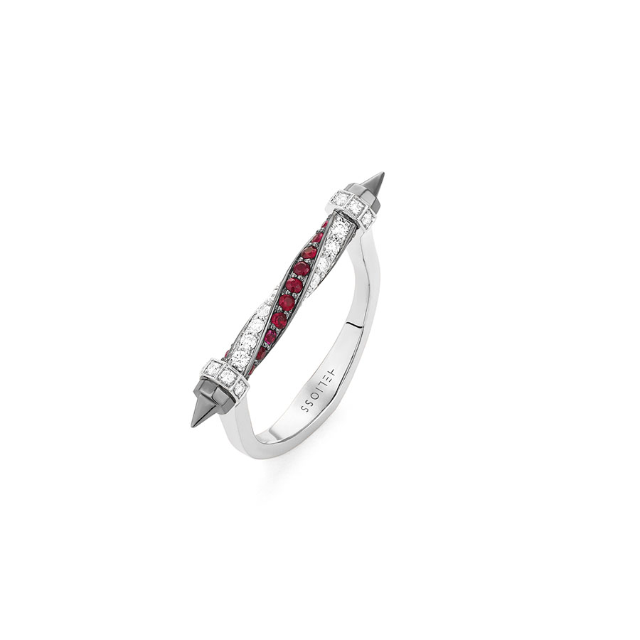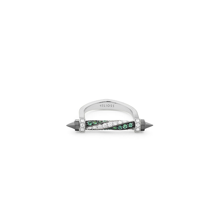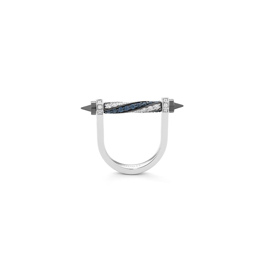 Rotating ring in the shape of a stirrup and spiral set with two-tone stones.