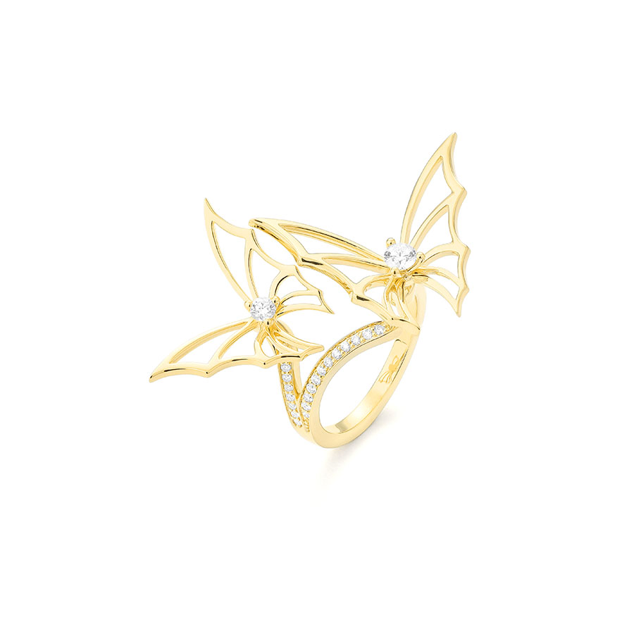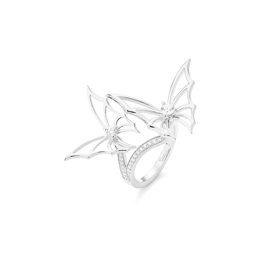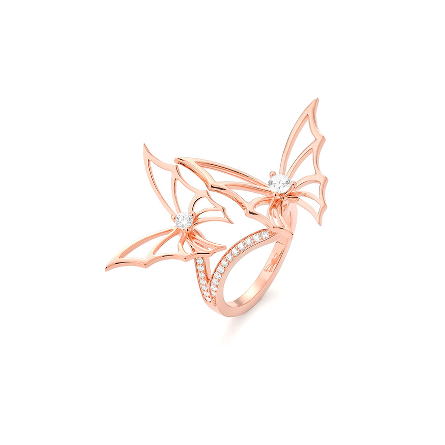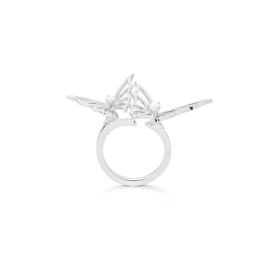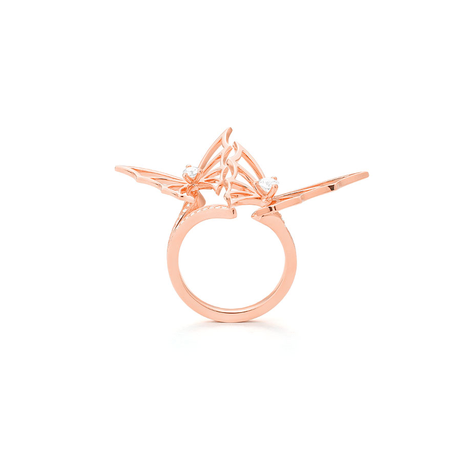 Open hoop ring with two butterflies, diamonds set in hoop and central motif.