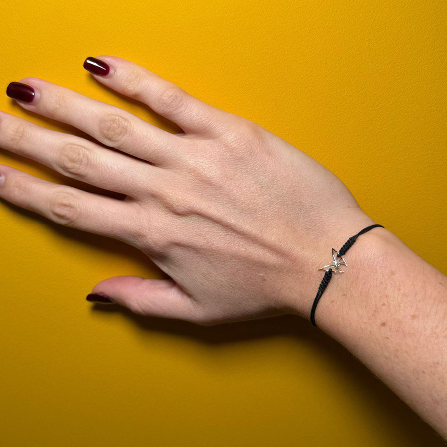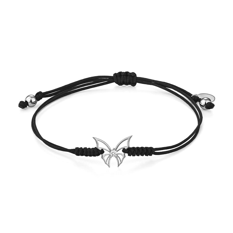 Pulsera con mariposa mini, diamante engastados en motivo central con cordón negro.